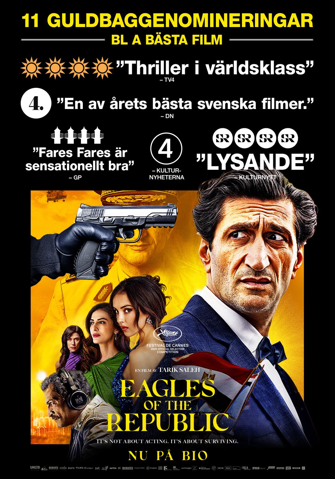 EAGLES OF THE REPUBLIC är en politisk thriller och den tredje och sista filmen i Tarik Salehs Kairo-trilogi efter framgångarna med The Nile Hilton Incident (Grand Jury Prize award, Sundance 2017) och Cannes-vinnaren Boy from Heaven aka Cairo Conspiracy (bästa manus, Cannes 2022). FIlmen är även utvald till Sveriges Oscarbidrag.