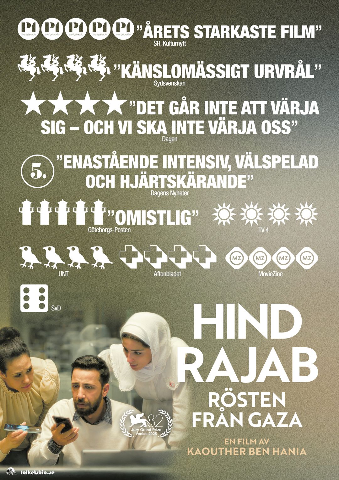 Hind Rajabs röst är ett intensivt och omskakande drama baserat på verkliga händelser och det autentiska nödsamtalet till Palestinska Röda Halvmånen. Filmen är regisserad av Oscarsnominerade regissören Kaouther Ben Hania och belönades med Grand Jury Prize vid Venedigs filmfestival 2025 och öppnade Gaza International Women’s Film Festival. Som exekutiva producenter medverkar några av filmvärldens mest uppmärksammade namn, däribland Brad Pitt, Joaquin Phoenix, Rooney Mara och Jonathan Glazer.