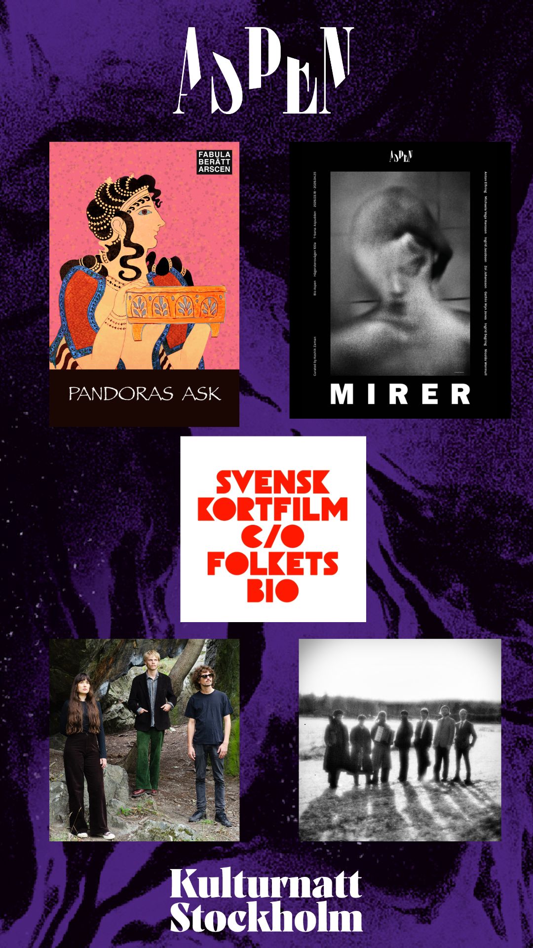 Hör Fabula inleda kvällen på Stora scen med storytelling om grekiska myter och sagor. Samtidigt visas ett kortfilmspaket i Lusoperan och Aspens konstuställning MIRER i bistron. Senare blir det konsert med Träet-Mund-Spilli & Första Vandringen på Stora scen och kvällen avslutas i Lusoperan med visning av fler kortfilmer!