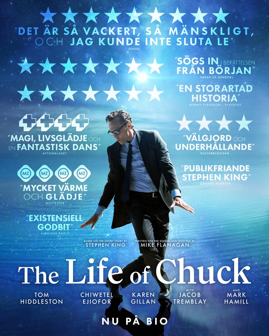 The Life of Chuck är en varm, genreöverskridande film om vår plats i universum och om allt som gör vårt liv meningsfullt. Filmens berättarröst tillhör Nick Offerman, och för regi samt manus står Mike Flanagan som tidigare bland annat regisserat Stephen Kings Doctor Sleep och serien Huset Ushers undergång.